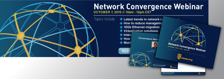 This project was for Blade.org, an association of blade server professionals that put on a webinar about network convergence. I designed the event branding and adapted it for web, email and presentation graphics.